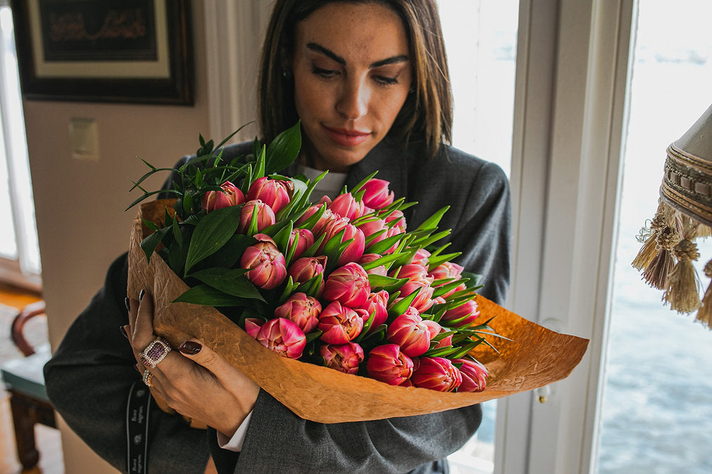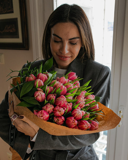 The bouquet, designed with 30 Dutch Tulips in pink tones, is accompanied by seasonal greens. A stylish and elegant choice.