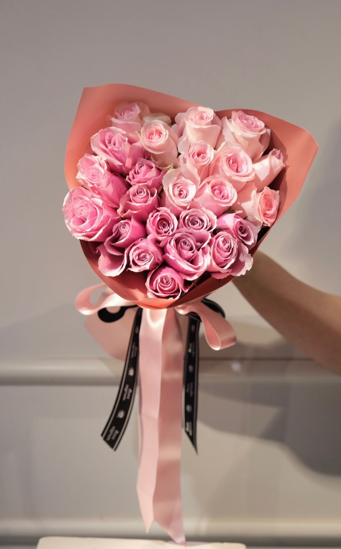 Kalp şeklinde pembe tonlarda yüksek kalite 23 adet Hollanda gül buketi. Şık, sade ve kalite sevenlere...