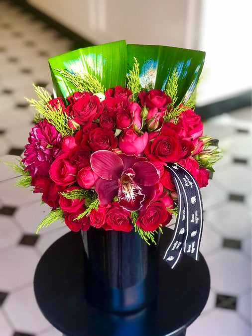 The stylish flower arrangement, designed with imported anastasia, orchids, rose varieties and seasonal greens in red tones, is delivered in a black glass cylinder vase. Width: 25 - 30 cm. Height: 35 - 40 cm.