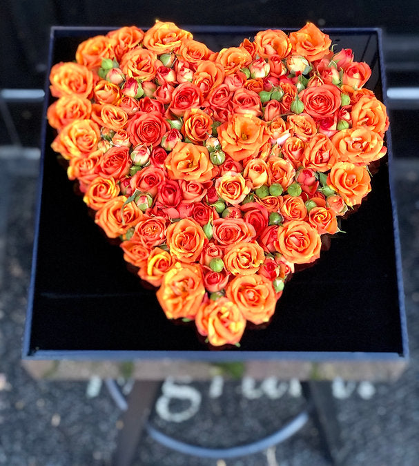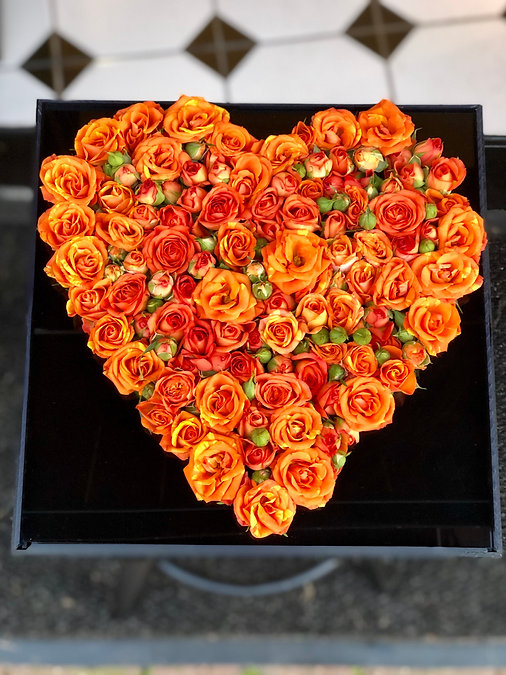Orange trellis roses in a luxurious and stylish plexi-heart box with a black lid. Make your loved ones feel special with these special boxes produced only for Rosa nigrum. Box size: 30X30X20 cm