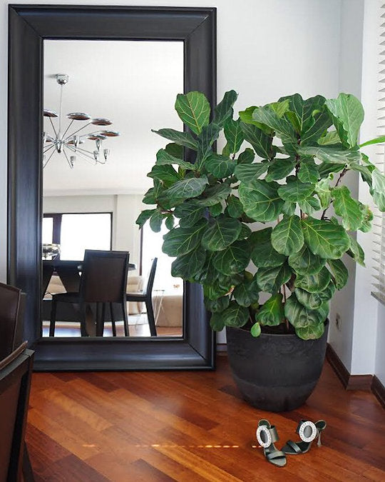 Pandora rubber with fiddle leaves in a pot in black and gray tones. Width: 50 - 60 cm. Height: 160 - 170 cm. *Depending on pot stock availability, style and color may vary, provided they are the same.