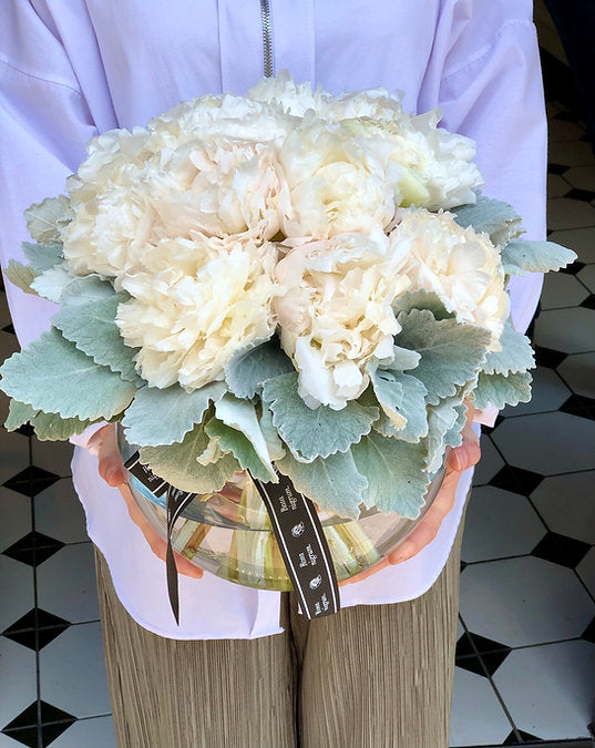 Çok sevilen ve en çok tercih edilen 10 adet beyaz şakayıkla hazırlanan şık ve elegan bukete, mevsim yeşilleri eşlik ediyor... Ürün cam küre vazoda teslim edilmektedir. Çap: 35 - 40 cm. Boy: 35 - 40 cm.
