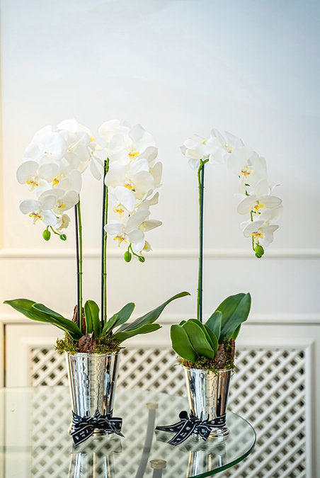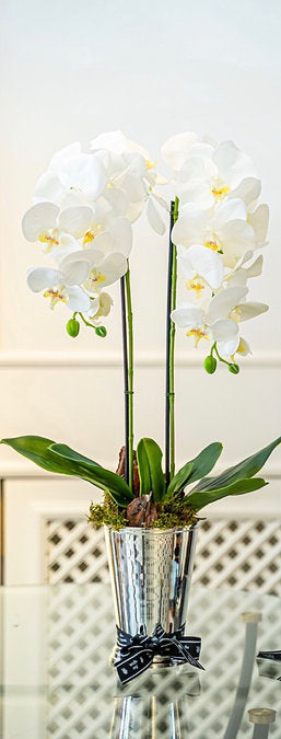 Hakiki gümüş kaplama vazoda, gerçeğe çok yakın 2 dal ithal yapay beyaz orkide. Uzunluk: 65 cm. En: 20 cm.